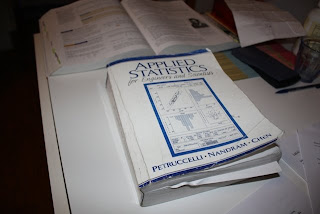 Fysikboken, "Serway´s principles of Physics" (ligger uppslagen bortanför), täcker upp andra halvan av matbordet och dessa två böcker väger tillsammans nästan 4 kg. Det ger ett snitt på 2 kg per bok. Det har jag lärt mig ifrån just statistikboken. Tänka sig vad man kan hinna lära sig på två veckor på Chalmers. Skämt å sido så är det nu dessa två böcker som kommer ta upp väldigt många timmar av min vakna tid den kommande månaden. Sen skriver jag tentorna och kan förhoppningsvis få slänga ut dessa böcker genom fönstret i glädje över väl godkända betyg. Snacka går ju... Håll en tumme för mig gällande mina studier. Å håll den andra för att jag inte dödar någon förbipasserande när jag gör mina glädjekast...